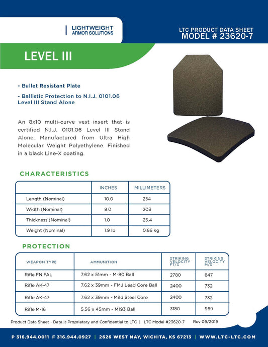 LTC Bullet Resistant Plate, Model #23707 Level III+ M855 & x39 MSC - Stand Alone, Multi Curve, SAPI CutRegular price $629.98Regular priceUnit price / per-