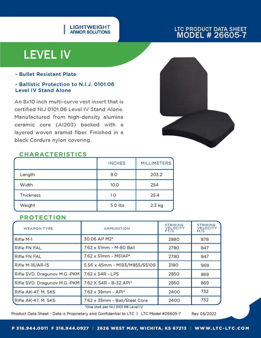 LTC Bullet Resistant Plate, Model #26605 Level IV - Stand Alone, Multi Curve, SAPI CutRegular price $358.98Regular priceUnit price / per